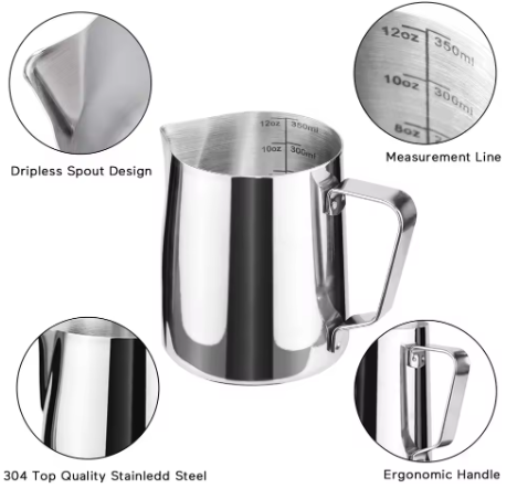 Dieses hochwertige Milchkännchen aus rostfreiem Edelstahl ist mehr als nur ein Accessoire: Mit seiner integrierten Messskala, dem tropffreien Ausguss und dem ergonomischen Griff wird es im Handumdrehen zum unverzichtbaren Begleiter – beim Aufschäumen von Milch, beim Portionieren von Brühe oder beim exakten Abmessen beim Backen. Robust, hygienisch und zeitlos schön – ein Stück Qualität, das man spürt.