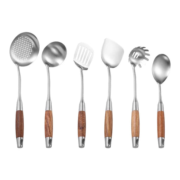 Robuste Edelstahl-Utensilien mit Rosewood-Griff für schnelleres, saubereres Kochen und einfache Handhabung jeden Tag.